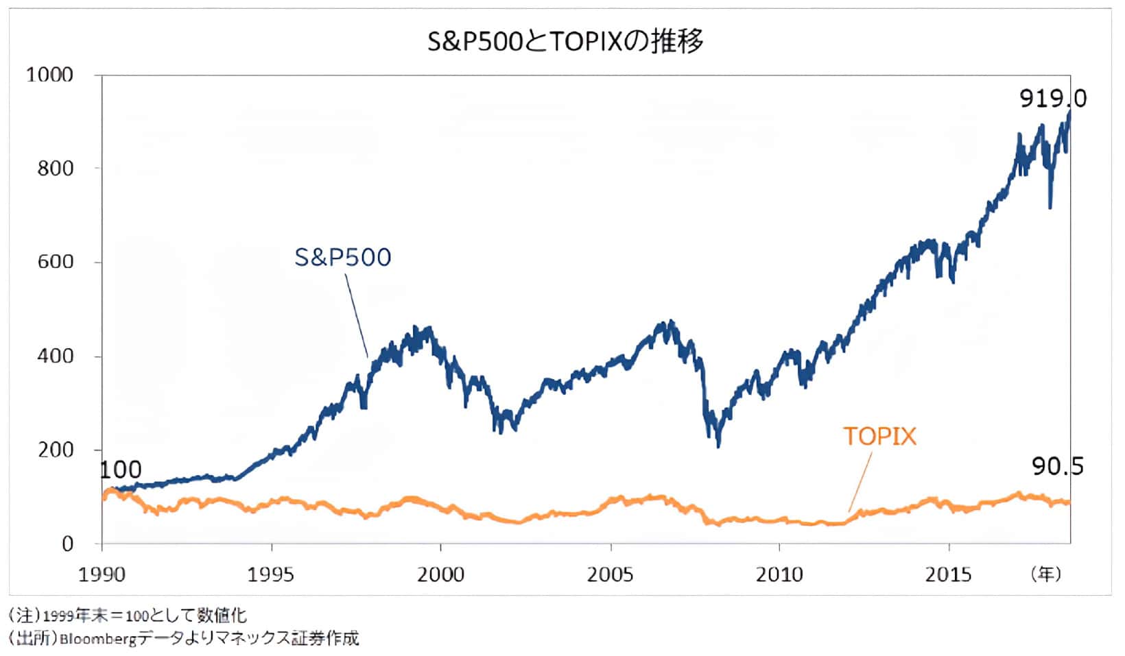 下のグラフは、日本とアメリカの代表的な株価指数の推移を示したものです。